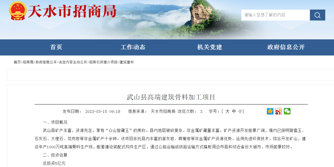 據(jù)中國(guó)砂石協(xié)會(huì)獲悉,近日,甘肅省天水市招商局公布了清水縣花崗巖建筑骨料生產(chǎn)項(xiàng)目和武山縣高端建筑骨料加工項(xiàng)目進(jìn)展情況,兩個(gè)項(xiàng)目合計(jì)投資23億元,每年共計(jì)生產(chǎn)加工4000萬噸建筑骨料。資源儲(chǔ)量共計(jì)約為11.2億噸!目前兩個(gè)項(xiàng)目都已完成項(xiàng)目建議書。